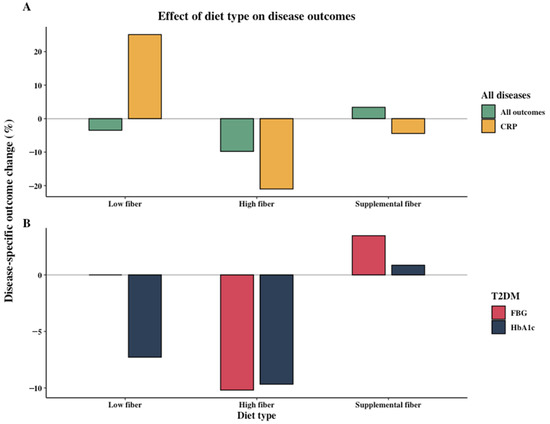 Effect of diet type (low fiber, high fiber, and supplemental fiber) on disease-specific outcomes for (A) all diseases combined and (B) Type 2 diabetes (T2DM). Percentage relative change between intervention group and control group or end intervention and baseline is shown. Averages are weighted based on number of participants in the intervention group. Statistical significance of outcomes not incorporated. (A) All disease outcomes (low fiber: 2 studies, n = 46; high fiber: 12 studies, n = 180; supplemental fiber: 11 studies, n = 246); C-reactive protein (CRP) (low fiber: 1 study, n = 24; high fiber: 7 studies, n = 105; supplemental fiber: 5 studies, n = 136). (B) Fasting blood glucose (FBG) (low fiber: 0 studies, n = 0; high fiber: 4 studies, n = 72; supplemental fiber: 6 studies, n = 150); Hemoglobin A1c (HbA1c) (low fiber: 1 study, n = 25; high fiber: 4 studies, n = 72; supplemental fiber: 6 studies, n = 163).