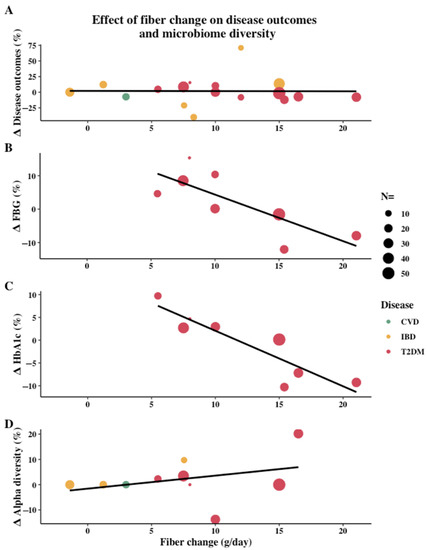 Effect of change in daily fiber intake (g/day) on (A) all diseases (type 2 diabetes (T2DM) (red points), inflammatory bowel disease (IBD) (yellow points), and cardiovascular disease (CVD) (green points)) with their respective disease-specific outcomes, (B) fasting blood glucose (FBG) in T2DM patients, (C) hemoglobin A1c (HbA1c) in T2DM patients, and (D) microbiome alpha diversity in all diseases. Percentage relative change between intervention group and control group or end intervention and baseline is used to determine change in disease and microbiome outcomes, as well as fiber change. Only studies which reported the amount of fiber intake were included. Size of the points are based on the number of participants (n =) in the intervention group. Statistical significance of outcomes not incorporated. In (D), changes reported as “non-significant” without numerical results were plotted as a change of 0.00%.