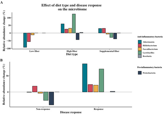 (A) Effect of diet type (low fiber, high fiber, and supplemental fiber) and (B) disease response on changes of bacteria in the gut microbiome. Percentage relative change between intervention group and control group or end intervention and baseline is shown. Averages are weighted based on number of participants in the intervention group (data not shown). Statistical significance of outcomes not incorporated.