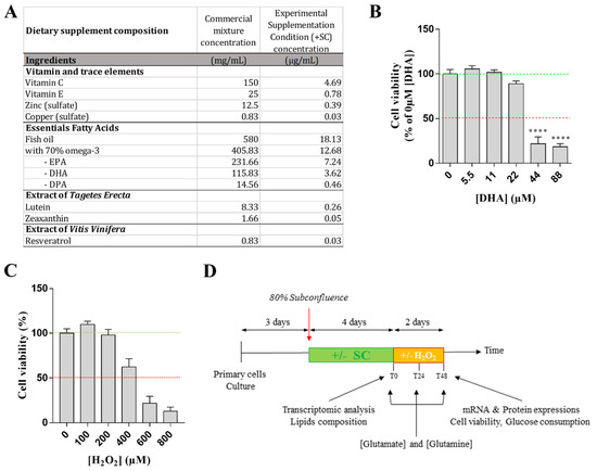 Dietary supplement composition and in vitro experimental design. (A) Dietary supplement composition. (B) Effect of dietary supplementation, expressed as equivalent DHA (µM), on Müller cells viability. All results are presented as mean ± SEM. Significant differences between groups are noted by **** p < 0.0001. (C) In vitro experimental design. SC means “supplementation condition”. (D) Experimental design of supplementation and oxidative stress treatment.