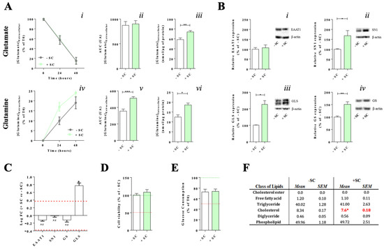 In +SC and −SC conditions, extracellular glutamine concentration increased progressively over 48 h (Figure 3A(iv)). However, glutamine release was significantly higher in +SC compared to −SC (p = 0.0001) as confirmed by AUC [512 ± 20 for +SC vs. 356 ± 24 for −SC] (Figure 3A(v)). This increase was associated with an increase (p = 0.0387) of SN1 translation without effect on its mRNA expressions [mRNA: −0.04 ± 0.06 LogFC (+SC vs. −SC); protein: 168 ± 25% for +SC vs. 100 ± 3% for −SC] (Figure 3B(ii),C). Surprisingly, intracellular glutamine was also significantly increased by 58% (p = 0.0101) in +SC compared to −SC [0.019 ± 0.0009 µmol/µg of proteins for +SC vs. 0.012 ± 0.001 µmol/µg of proteins for −SC] (Figure 3A(vi)). In our conditions, this increase was associated with a significant up-regulation of glutamine synthetase (GS) protein translation (p = 0.0011) without mRNA variation [protein: 150 ± 10% for +SC vs. 100 ± 4% for −SC; mRNA: −0.12 ± 0.09 LogFC (+SC vs. −SC)] (Figure 3B(iv),C). Therefore, these results suggested that supplement increase glutamine synthesis. Nevertheless, the genic and biochemical modifications of the glutamate/glutamine metabolic cycle in +SC had no impact on cell viability [72.74 ± 5.24% for −SC vs. 73.91 ± 4.35% for +SC, p = 0.999] (Figure 3D) or glucose consumption [100.00 ± 4.90% for −SC vs. 108.50 ± 7.38% for +SC, p = 0.969] (Figure 3E). Similarly, nutritional supplementation did not have any significant effect on lipid class composition except a slight modification of cholesterol levels [8.34 ± 0.17% of total lipids for −SC vs. 7.6 ± 0.17% of total lipids for +SC] (Figure 3F). No difference was observed in the fatty acid content of cells, and especially in the omega-3 polyunsaturated fatty acids (PUFAs) eicosapentaenoic acid (EPA) and docosahexaenoic acid (DHA) (data not shown).