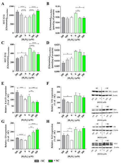 With supplementation (+SC), glutamate concentration in culture medium decreased over time with or without sub-lethal (100 µM or 200 µM H2O2) conditions (Data not shown). However, H2O2 reduced glutamate uptake in a dose-dependent manner (Figure 4A) as shown by the extracellular glutamate AUC. Indeed, AUC was significantly increased (p < 0.0001) by 13% for 100 µM H2O2 (1031 ± 66 for 100 µM H2O2 vs. 902 ± 67 for untreated conditions) and by 38% (p < 0.0001) for 200 µM H2O2 (1244 ± 76 for 200 µM H2O2 vs. 902 ± 67 for untreated conditions) compared to 0 µM H2O2. This result is associated with a significant decrease of EAAT1 expression by 36% for 100 µM H2O2 (p = 0.0033) and by 35% for 200 µM H2O2 (p = 0.0065) (79 ± 7% for 100 µM H2O2, 81 ± 9% for 200 µM H2O2 and 125 ± 15% for 0 µM H2O2) (Figure 4E), and also associated with a significant decrease of intracellular glutamate concentration to a basal level whatever the H2O2 concentration was (56 ± 3 nmol/µg of protein for 100µM H2O2, p = 0.031; 56 ± 7 nmol/µg of protein for 200 µM H2O2 p = 0.033 and 74 ± 3 nmol/µg of protein for 0 µM H2O2) (Figure 4B). Interestingly, in presence of sub-lethal oxidative conditions (100 µM and 200 µM), the intracellular glutamate concentration is similar to the −SC ones but, surprisingly, whatever the oxidative stress was, the GLS expression stayed upregulated in +SC (204 ± 27% for 100 µM H2O2, 240 ± 34% for 200 µM H2O2 and 227 ± 37% for 0 µM H2O2) (Figure 4H).