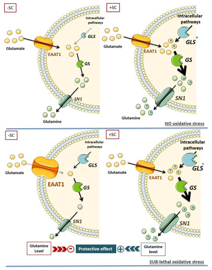 Schematic representation of nutritional supplementation impact on Müller cells’ glutamine homeostasis with or without oxidative stress. The upper panels represent the glutamate/glutamine cycle without (−SC) and with (+SC) nutritional supplementation in absence of oxidative stress. The lower panels present the glutamate/glutamine cycle without (−SC) and with (+SC) nutritional supplementation in presence of oxidative stress. EAAT1: glutamate transporter; SN1: glutamine transporter; GLS: glutaminase; GS: glutamine synthetase. The asterisks (*) represent the new synthesis of glutamate or glutamine induced by action of SC on intracellular pathways. The size of the characters or arrows in the figure’s images represent the significance of the process that they illustrate or the quantity of a protein or enzyme: the bigger the size, the more significant the biological item is.