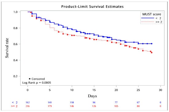 Kaplan–Meier survival curve. Survival probability based on MUST score (≥2 vs. <2).