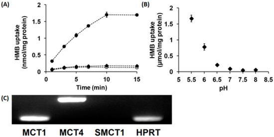 The biological effects of HMB are not restricted to the peripheral tissues. Orally administered HMB has been shown to have a broad spectrum of beneficial effects in the brain, as evident from in vitro and in vivo studies [12,13,14]. In vitro, HMB promotes differentiation and neurite outgrowth in the mouse neuroblastoma cell line Neuro2a in culture [12]. In vivo, HMB prevents the age-related loss of dendrites in pyramidal neurons in rats [13], and also ameliorates age-related decline in cognitive performance in rats [14]. As in vivo effects are seen with HMB administered to the animals orally, it is inferred that HMB is able to cross the blood–brain barrier (BBB), but there have been no published reports in the literature describing the transport of HMB in BBB endothelial cells. Recently, we reported that HMB is transported into skeletal muscle cells via the H+-coupled monocarboxylate transporters MCT1 (monocarboxylate transporter 1) and MCT4 (monocarboxylate transporter 4) [15]. BBB endothelial cells express H+-coupled monocarboxylate transporters [16,17,18] and play a key role in the transport of physiologically important monocarboxylates such as lactate and β-hydroxybutyrate (a ketone body), which are transferred from the systemic circulation into the brain across the BBB and function as alternative energy substrates to neurons when glucose supply is limited [19,20]. Therefore, we hypothesized that the same transporters in BBB endothelial cells are also involved in the cellular uptake of HMB, a monocarboxylate structurally similar to lactate and β-hydroxybutyrate. We tested this hypothesis in vitro using the human brain microvascular endothelial cell line hCMEC/D3.