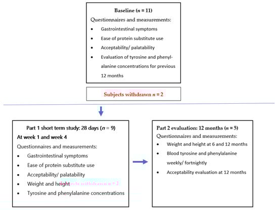 Part 1: in a 28-day short-term acceptability and tolerance study, children replaced one or more of their usual daily doses of L-AA with the same amount of protein equivalent from the study product. Questionnaires on gastrointestinal tolerance, palatability and ease of use of L-AA and study product were completed by parents at baseline, week 1 and week 4 (see Supplementary Information for questionnaires). Weekly fasting blood samples were taken for tyrosine and phenylalanine. Target blood tyrosine ranges for children were 200 to 400 μmol/L as recommended by an international working group on HTI [3]. Weight and height were measured at baseline and day 28.
