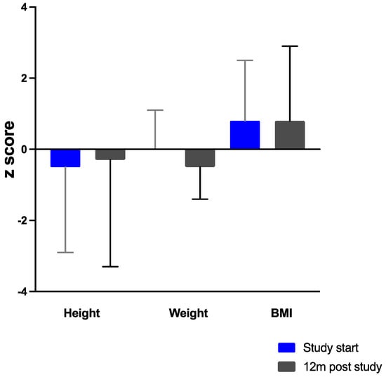 In part 1 (n = 9), height, weight, and BMI z-scores remained unchanged. Median z-scores for height were −0.5 (range −2.9 to 0.8), weight, −0.3 (range −1.7 to 1.1) and BMI, 0 (range −2.0 to 2.5). Anthropometry is described in Figure 2 for n = 5 children who continued on the study product. After 12 months, height z-scores were improved (median z score −0.3) but was not statistically significant and fell within the population norm.