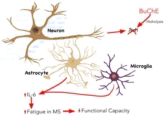 In addition, and specifically in MS, the levels of IL-6 are pathologically associated with fatigue, which is characteristic of the disease, in contrast to other elements of the immune system, such as T cells and other peripheral markers of inflammation, for instance, C-reactive protein (CRP), erythrocyte sedimentation rate, or soluble forms of intercellular adhesion molecule-1 [24]. Furthermore, fatigue depends on the relapse and remission phases, which are directly related to fluctuations in IL-6 [25,26]. Finally, fatigue is also related to functional disability in these patients [27], which could explain the negative correlation between the activity of BuChE and loss of functionality in MS [28]. (Figure 1).