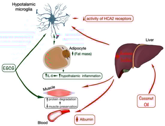 Beneficial effects of EGCG (marked in green) and coconut oil as a source of ketonic bodies (marked in red) on anthropometry by preserving skeletal muscle, improving the state of inflammation with an increase in albumin levels, and especially by decreasing fat mass, which is related to lower inflammation in the hypothalamus (microglia) and in the blood, decreasing IL-6 levels. Abbreviations: EGCG: epigallocatechin gallate; IL-6: interleukin 6.