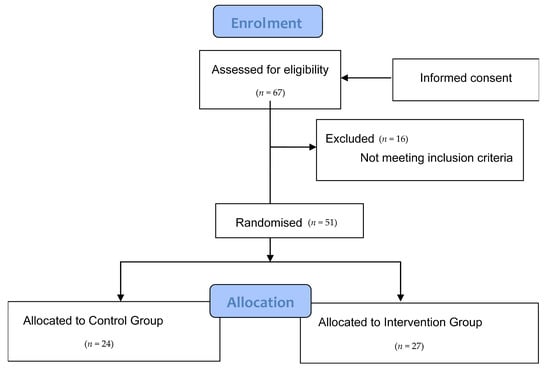 The participants in the study were MS patients who were affiliated members of different MS associations in the Region of Valencia. For this purpose, we previously contacted the management of each centre in order to explain the project, and they sent the information to patients of their associations. A total of 67 patients showed interest in participating, after being diagnosed with the disease by means of the McDonald test conducted by neurologists, which aims to determine that there has been damage in the CNS over time (there must be evidence that damage was caused at different times) and in space (evidence that there are lesions in at least two different parts of the CNS) based on clinical, radiographic and laboratory criteria; the measure shows great sensibility and specificity, making it a reliable tool to diagnose MS [47]. The following inclusion criteria were applied to these patients: patients over 18 years of age, diagnosed with RRMS or SPMS at least one year prior, treated with glatiramer acetate and interferon beta, and to not have had a relapse in the last 6 months. The exclusion criteria included: pregnant or breastfeeding women, patients with dementia, evidence of alcohol or drug abuse, heart disease, patients with kidney conditions with creatinine levels two times higher than normal markers, patients taking antidepressants, patients with metabolic diseases, or MS patients who were included in other studies. Once these criteria were applied, the final sample included 51 patients (Figure 3).