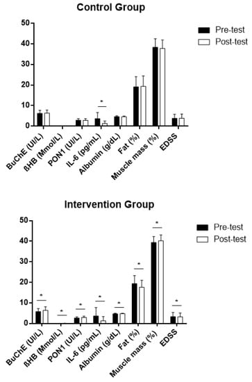 Intragroup differences in the study variables after intervention (post-test) expressed in average values ± standard deviation, both in the intervention and the control groups. BuChE: butyrylcholinesterase; βHB: β-hydroxybutyrate; PON1: paraoxonase 1; IL-6: interleukin 6; Fat (%): body fat percentage; Muscle mass (%): body muscle percentage; EDSS: Expanded Disability Status Scale; Z: Wilcoxon signed-rank test. * Statistically significant differences, p < 0.05.
