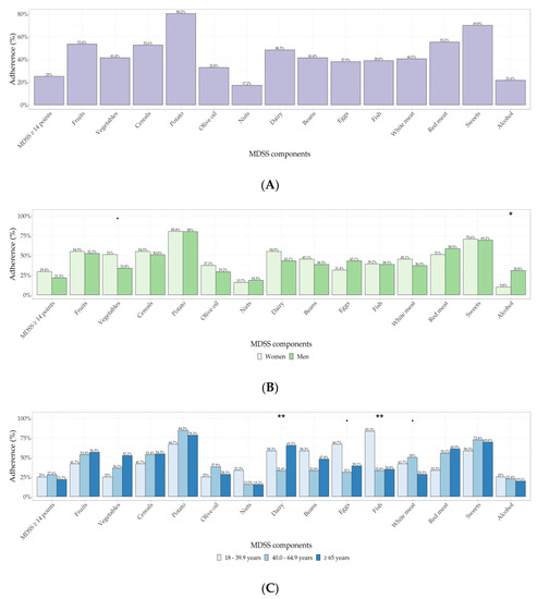 (A) Overall adherence to the MeDi and its components. (B) Sex differences in adherence to the MeDi. (C) MeDi adherence in different age groups of KTR patients. Abbreviations: MeDi—Mediterranean Diet, MDSS—Mediterranean Diet Serving Score, p-value < 0.1 depicted with dot, p-value < 0.05 depicted with *, p-value < 0.01 depicted with **.
