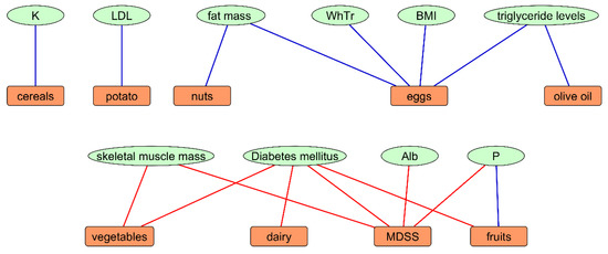 Summary presentation of signifficant associations between adherence to components of the MeDi and researched parameters in Dalmatian KTRs. Explanation: red lines represent positive associations (OR > 1, p < 0.05), while blue lines represent negative associations (OR < 1, p < 0.05). Abbreviations: MDSS—Mediterranean Diet Serving Score, Alb—serum albumin (g/L), P—phosphates (mmol/L), LDL—low-density lipoprotein cholesterol (mmol/L), K—potassium (mmol/L), BMI—Body Mass Index, WHtR—waist to height ratio, MeDi—Mediterranean Diet.