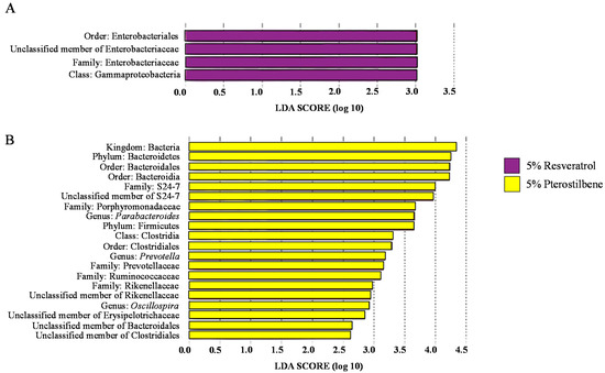 Furthermore, the linear discriminant analysis effect size method (LEfSe) was used to investigate the bacterial biomarkers and isolate gut microbiome differences between the treatment groups. The Enterobacteriales order and Enterobacteriaceae family, a member of the Proteobacteria phylum, was significantly enriched (p < 0.05) in the 5% resveratrol treatment group compared with the no injection control group (Figure 5A). However, in the 5% pterostilbene treatment group, we observed that the most differentially enriched taxa were related to members of the Bacteroidetes phylum, such as the S24-7 family, members of the Clostridiales order and the Oscillospira genus compared with the no injection control group (Figure 5B).