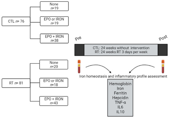 This adverse scenario motivates physicians and researchers to seek alternative and non-pharmacological treatments to counteract the adverse events related to ESA therapy and iron supplementation. A recent study from our laboratory outlined the positive effects of resistance training (RT) on iron deficiency in ESRD patients, suggesting this training model as an adjunct treatment for anemia [6]. In our study, 72.61% of the patients underwent EPO treatment (control group (CTL) = 69.73%; resistance training group (RT) = 75.30%) and 54.14% underwent oral iron supplementation (CTL = 55.26%; RT = 53.08%). Given that both treatments may influence multifactorial pathways related to inflammation and iron status, and RT is an important regulator of both aforementioned factors [6,7,8,9], two fundamental questions are raised here: (I) Does RT enhance the treatment with EPO and iron sulfate in ESRD older individuals? (II) Is RT an effective treatment on its own to improve iron status?