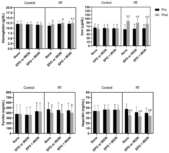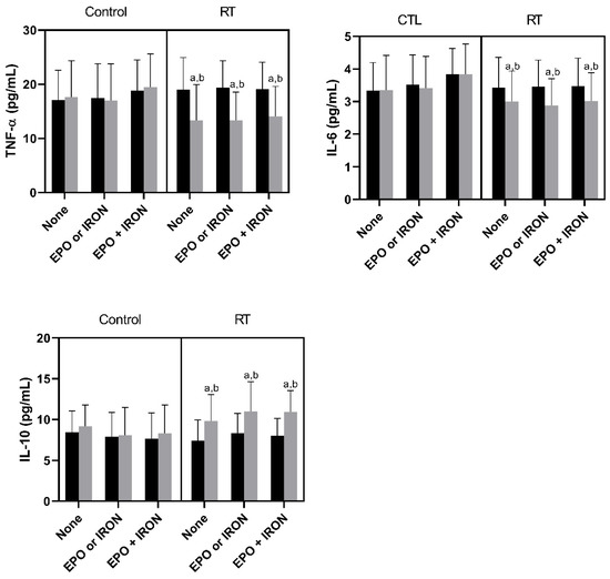 As displayed in Figure 4, regardless of the treatment, the RT group showed modulated hemoglobin, iron, ferritin, hepcidin, and cytokine levels. However, RT—IRON + EPO presented a lower decrease in hepcidin in relation to RT—none.