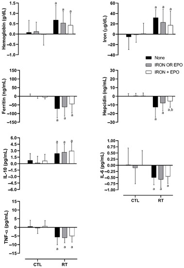 Deltas (post/pre) of hemoglobin, iron, ferritin, hepcidin, and cytokine response to RT following different iron treatments. CTL: control group; RT: resistance training group. a p < 0.05 in relation to the corresponding treatment in CTL. b p < 0.05 in relation to RT—none.