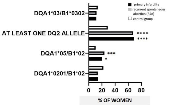 HLA distribution in the study population. Black bars, primary infertility; grey bars, recurrent spontaneous abortion (RSA); white bars, control group. DQA1*03 with DQB1*0302 defined “HLA-DQ8 alleles positivity”. The notation “at least one DQ2 allele” described the occurrence of at least one of the following alleles: DQA1*0201, DQA1*05, and B1*02. HLA-DQ2 allele positivity defined the presence of at least one of the combinations: DQA1*0201/B1*02 and DQA1*05/B1*02. A significantly higher prevalence of at least one DQ2 allele was revealed in infertile and RSA women than in controls. HLA-DQ2 positivity as DQA1*05/B1*02 showed a higher prevalence in infertile and RSA women compared with controls. Chi-squared test or Fisher’ exact test were used to compare groups (* p < 0.05; *** p ≤ 0.001, **** p ≤ 0.0001 compared with controls).