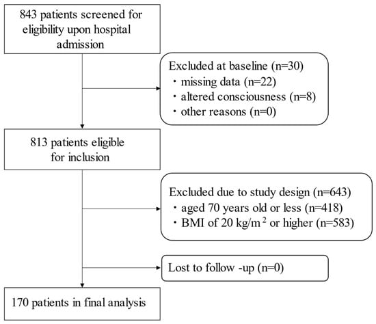 During the study period, a total of 843 stroke patients were newly admitted to the hospital. Patients with missing data (n = 22) and altered consciousness (n = 8) were excluded. Data from 813 patients were considered for inclusion in the study. Among them, patients aged 70 years or younger (n = 418) and those with BMI ≥ 20 (n = 583) were excluded. Finally, 170 patients who were over 70 years of age and had a BMI of <20.0 were included in the analysis (Figure 1).