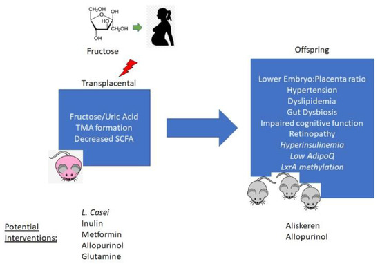 Mechanisms of developmental programming of offspring phenotypes by maternal fructose exposure and potential options for preventive interventions. TMA—trimethylamine; SCFA—short chain fatty acids; LxrA—Liver-X-receptor alpha.