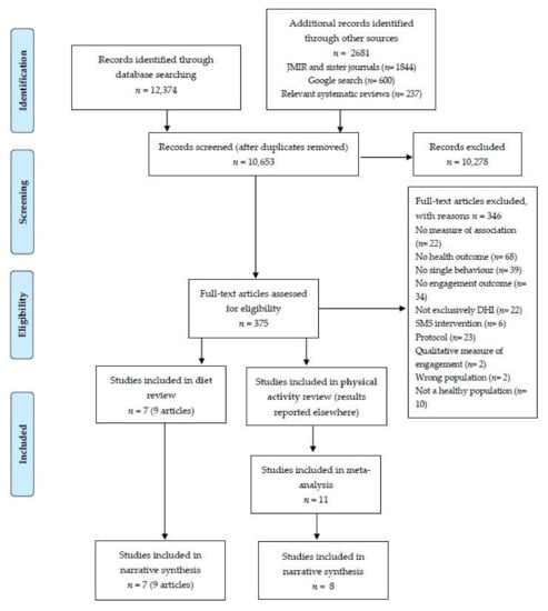 - As this review was only focused on dietary intake, studies that targeted multiple health behaviors for prevention of chronic disease (e.g., sleep and diet, or diet and physical activity) were excluded to reduce the risk of other health behaviors confounding the association between engagement and dietary intake;