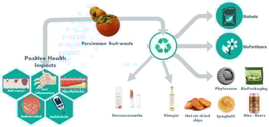 Persimmon (Diospyros kaki L.) fruit’s phytochemical profile includes carotenoids, proanthocyanidins, and gallic acid among other phenolic compounds and vitamins. A huge antioxidant potential is present given this richness in antioxidant compounds. These bioactive compounds impact on health benefits. The intersection of nutrition and sustainability, the key idea behind the EAT-Lancet Commission, which could improve human health and decrease the global impact of food-related health conditions such as cancer, heart disease, diabetes, and obesity, bring the discussion regarding persimmon beyond the health effects from its consumption, but also on the valorization of a very perishable food that spoils quickly. A broad option of edible products with better storage stability or solutions that apply persimmon and its byproducts in the reinvention of old products or even creating new products, or with new and better packaging for the preservation of food products with postharvest technologies to preserve and extend the shelf-life of persimmon food products. Facing a global food crisis and the climate emergency, new and better day-to-day solutions are needed right now. Therefore, the use of persimmon waste has also been discussed as a good solution to produce biofuel, eco-friendly alternative reductants for fabric dyes, green plant growth regulator, biodegradable and edible films for vegetable packaging, antimicrobial activity against foodborne methicillin-resistant Staphylococcus aureus found in retail pork, anti-Helicobacter pylori agents from pedicel extracts, and persimmon pectin-based emulsifiers to prevent lipid peroxidation, among other solutions presented in the revised literature. It has become clear that the uses for persimmon go far beyond the kitchen table and the health impact consumption demonstrated over the years. The desired sustainable transition is already in progress, however, mechanistic studies and clinical trials are essential and scaling-up is fundamental to the future.