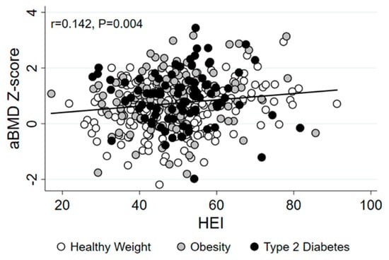 We present a hypothesis generating study aimed at assessing relationships between diet quality, measured via HEI, and areal bone mineral density (aBMD) in a cross-sectional sample of youth with healthy weight, obesity, and T2D. Additional analyses were performed in relation to individual subcomponents of the HEI and aBMD.