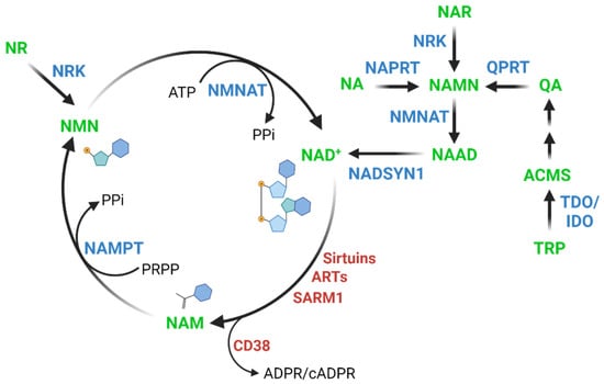 NAD+ biosynthesis pathways in mammalian cells. ACMS: 2-amino-3-carboxymuconate, NA: nicotinic acid, NAD+: nicotinamide adenine dinucleotide, NAM: nicotinamide, NAMN: nicotinic acid mononucleotide, NAR: nicotinic acid riboside, NMN: nicotinamide mononucleotide, NAAD: nicotinic acid adenine dinucleotide, NR: nicotinamide riboside, QA: quinolinic acid, TRP: tryptophan, IDO: indoleamine-2,3-dioxygenase, NADSYN1: NAD synthetase, NAMPT: nicotinamide phosphoribosyltransferase, NAPRT: nicotinic acid phosphoribosyltransferase, NMNAT: nicotinamide mononucleotide adenylyl transferase, NRK: NR Kinase, QPRT: quinolinic acid phosphoribosyltransferase, TDO: tryptophan-2,3-dioxygenase, ARTs: ADP-ribosyltransferases, CD38: ADP-ribosyl cyclase/cyclic ADP-ribose hydrolase 1, SARM1: NAD+ hydroxylase SARM1, ATP: adenosine triphosphate, PPi: inorganic pyrophosphate, PRPP: 5-phosphoribosyl-1-pyrophosphate.