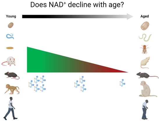 While there is certainly evidence of a decline in NAD+ levels in age-related diseases in both humans and animal models, reductions in NAD+ as part of physiological aging are also commonly being touted as a universal truth for all tissues in all organisms. This review will discuss the current literature linking NAD+ levels to aging across multiple tissues and species, including humans, to possibly challenge the apparent consensus in the field that NAD+ levels universally decline with age (Figure 2).