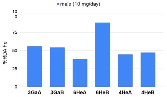 Only products enriched with iron compounds (3GaA, 3GaB, 6HeA, 6HeB, 4HeA, 4HeB) deserved attention, as they enabled the realisation of the RDA Fe in the range of 45–88% for men (Figure 1). The best iron source was the product 6HeB. All the analysed iron-enriched products contained organic salt of Fe-iron gluconate which is one of the most common Fe compounds used in dietary supplements []. Dietary iron comes in two forms: haem available in animal products (red meat, offal, liver) and non-haem present in plant-based products. The haem form is better absorbed by the body within the levels of 25–35% []. Its bioavailability is not affected by factors such as the content of Ca in the diet, phytates, or proteins, which reduce the absorption of non-haem iron to 2–20%. Dietary supplements might contain non-haem (Fe salts) and haem forms. The ferrous salts (sulphate, fumarate, and gluconate) are better absorbed (10–15% bioavailability) than ferric salts []. The bioavailability of Fe depends on the type of Fe salt, and that of iron gluconate amounts to 12% []. As a result, consumers should take approximately 150 mg of iron gluconate to provide RDA (18 mg/day []). Seiler et al. [] reported that supplementation with 60–80 mg of Fe/day for 12 weeks may be an effective treatment of Fe deficiency in a healthy population. WHO recommended a dose of 30 to 60 mg of elemental Fe for menstruating, non-pregnant female adolescents, particularly in settings where the prevalence of anaemia is 40% or higher []. Taking into account the manufacturer’s recommended dosage, Fe-enriched supplements provided from 4.5 to 8.8 mg of elemental Fe (EDI), which means that they might not have a significant effect on the prevention of anaemia. By comparison, unenriched supplements provided no more than 4.1% of the RDA (Table S5) while the portion of the analysed beetroots–from 2.8% to 8.8% of RDA (Table S4).