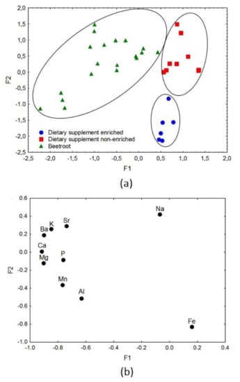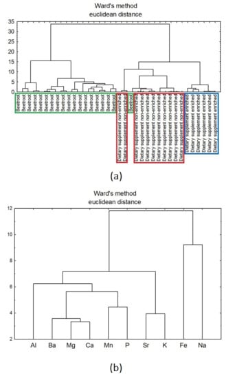 The dendrogram (Figure 7) was built of two main clusters, one of which was assigned to the beetroot samples and the other to the dietary supplements. Beetroot samples were discriminated by Al, Ba, Mg, Ca, Mn, P, Sr, and K, and dietary supplements’ ones by Fe and Na (Figure 7b).