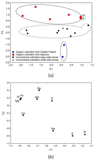 Based on the results of the first factor analysis, further analyses were performed to obtain detailed information concerning datasets of beetroot samples and dietary supplements. Factor analysis of beetroot samples diversified samples into products grown conventionally and organic (Figure 5a,b). In addition, a clear separation of beetroot samples cultivated organically because of the geographical origin was also obtained. There were also distinguished samples grown conventionally from large and small-retail stores. It was found that 68.0% of the total variance was explained by F1 (47.8%) and F2 (20.2%). The eigenvalues were 4.78 and 2.02 for F1 and F2, respectively. Factor 2 was responsible for the diversification of the organic beetroot samples from different geographic origins (Mazovia-Greater Poland), as well as conventional samples from stores of various size scales (Figure 5a). Organic beetroot samples from the Mazovian area and conventional samples from small-retail stores were characterized by higher F2 values and Mg, Al, Fe, Mn, Ba, and P (Figure 5b). Lower F2 values (described by Na, K, and Sr) corresponded to the organic samples from Greater Poland and conventional ones purchased in large-retail stores. Due to the limited information about the product provided by the supplier, it was not possible to explain the influence of the factor F1 on the distribution of the samples.