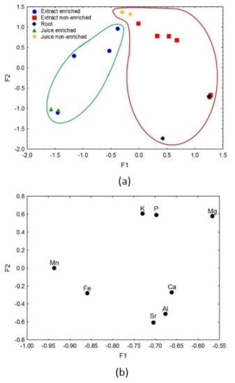 Factor analysis of dietary supplements dataset was performed using the following descriptors: K, P, Mg, Mn, Fe, Ca, Sr, and Al. The analysis resulted in the separation of dietary supplements’ samples in terms of various types of the main component (extract, root, and juice) as well as iron-enrichment (Figure 6a,b). The total value of the explained variance was 77.3%, of which F1 amounted to 54.4% while F2 to 22.9%. The eigenvalues for factors 1 and 2 were 4.35 and 1.83, respectively. Factor 1 was responsible for the diversification of dietary supplements’ samples according to the iron-enrichment of the product (Figure 6a). Higher values of F1, described by K, P, Mg, Ca, Sr, and Al, corresponded to samples of supplements containing root, non-enriched extracts, and juice. In turn, Mn and Fe were responsible for the distribution of iron-enriched dietary supplements (extracts and juice), which were described by lower F1 values. Higher values of F2 as well as K, P, and Mg corresponded mainly to the group of supplements’ samples with extracts and juice as their main components (Figure 6b). It might be supposed that the supplement manufacturer used the expressions extract-juice interchangeably in the declaration on the packaging. It was found that dietary supplements contained in their composition beetroot juice provided higher amounts of various elements, i.e., Fe, Mn, P, K, and Mg. On the other hand, the supplements made of root had a higher content of Ca, Al, and Sr. This analysis showed the importance of a dietary supplement’s choice according to the degree of processing of the main ingredient. It was noted that F2 also differentiated the analysed dietary supplement samples. However, due to the limited amount of information about products, it was not possible to demonstrate which feature is responsible for such distinction.
