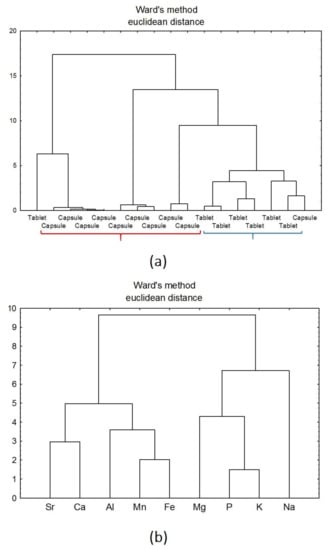 Application of CA allowed on differentiation of supplements samples according to their pharmaceutical form (tablet and capsule) (Figure 8). The dendrogram was built of two main clusters. There can be distinguished clusters concerning capsule and tablet dietary supplements’ samples (Figure 8a,b). The elements Sr, Ca, Al, Mn, and Fe were responsible for the distribution of products in the form of capsules. In the case of tablets, samples were discriminated by Mg, P, K, and Na. It was found that Na shows a strong dependence in the studied group of samples. One capsule, which was improperly assigned to the tablets cluster contained high levels of Na. Na might be a component of excipients used in the production of dietary supplements and this affected such diversification (Figure 8a). It was also found that one tablet was improperly assigned to the capsules clusters. This is probably due to poorly defined information on the tablet’s label by the manufacturer.
