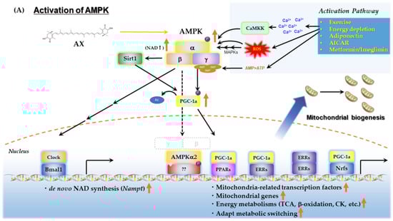 AX regulates various mitochondria-associated metabolic pathways, mitochondrial biogenesis and its quality control via AMPK activation. (A) AMPK is activated by exercise, energy depletion, or certain active drugs (e.g., AICAR, adiponectin, metformin and imeglimin) by (1) increased Ca2+ influx; (2) direct modification by ROS and activation of MAPKs; and (3) increased AMP/ATP ratio. Activated AMPK induces activation of PGC-1α and related gene expression, leading to enhanced energy metabolisms, adapted metabolic switching, and increased mitochondria biogenesis. Furthermore, AMPK regulates gene expression of Nampt and promotes de novo synthesis of NAD+ in the cell. As a result, it enhances the activity of Sirtuins and further enhances the activity of PGC-1α. Thus, AMPK/Sirtuins/PGC-1α forms a positive feedback loop in their actions. (B) AMPK contributes to mitochondrial quality control; AMPK not only enhances mitochondrial biogenesis, but also regulates mitochondrial fission and fusion via phosphorylation of Mef, and induces mitophagy in autophagosomes via the phosphorylation of Ulk-1 for the impaired mitochondria. AX activates AMPK. In particular, it has been reported that AX affects the points indicated by the orange arrows. In this figure, precise and detailed signal pathways are not shown, to avoid complications. This figure was adapted from the reference [116,133,134].