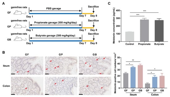 Propionate and butyrate increased melatonin levels both in vivo and in vitro. (A) Schematic of the animal experiments. (B) Representative images (left, 400×) and quantification of immunohistochemistry (IHC) staining (right) for melatonin-positive cells in the ileal and colonic mucosa after sodium propionate or sodium butyrate were administered to germfree rats (n = 6; scale bars: 50 μm). Arrows indicate melatonin-positive cells. Analysis was performed using Kruskal–Wallis test with Dunn’s multiple comparison post-hoc test. (C) Effects of sodium propionate (10 mM) or sodium butyrate (10 mM) on the concentration of melatonin in BON-1 cell supernatant detected using ELISA. Analysis was performed using one-way ANOVA with Tukey’s post-hoc test (n = 6). GF, germfree rats receiving PBS gavage; GP, germfree rats receiving propionate gavage; GB, germfree rats receiving butyrate gavage. * p < 0.05, ** p < 0.01, *** p < 0.001.