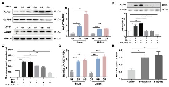 Propionate and butyrate increased intestinal AANAT level in rats. (A) Representative images (left) and quantification of intestinal AANAT level (right) detected using Western blotting after administration of sodium propionate or sodium butyrate to germfree rats. Analysis was performed using Brown–Forsythe and Welch ANOVA test with Tamhane’s T2 post-hoc test (n = 6). (B) Representative images (above) and quantification of AANAT level (below) in BON-1 cells after propionate/butyrate (10 mM) treatment for 24 h with or without Aanat siRNA treatment for 32 h. Results were obtained using Western blotting and analyzed using one-way ANOVA with Tukey’s post-hoc test. n = 6. (C) Melatonin concentration in BON-1 cell supernatant after propionate/butyrate (10 mM) treatment for 24 h with or without Aanat siRNA treatment for 32 h. Results were detected using ELISA and analyzed using one-way ANOVA with Tukey’s post-hoc test (n = 6). (D) Intestinal Aanat mRNA expression normalized to β-actin expression after administration of sodium propionate or sodium butyrate to germfree rats. Results were obtained using qPCR and analyzed using one-way ANOVA with Tukey’s post-hoc test (n = 6). (E) Aanat mRNA expression normalized to β-actin expression in BON-1 cells after treatment with propionate/butyrate (10 mM) for 24 h. Analysis was performed using one-way ANOVA with Tukey’s post-hoc test (n = 6). GF, germfree rats receiving PBS gavage; GP, germfree rats receiving propionate gavage; GB, germfree rats receiving butyrate gavage. * p < 0.05, ** p < 0.01, *** p < 0.001.