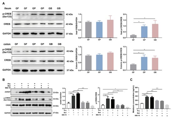 Transcriptional activation of the Aanat gene is an important mechanism for the induction of melatonin biosynthesis. To identify candidates that regulate Aanat transcription, we retrieved the potential transcription factors that could bind to the promoter region of the Aanat gene from the TRANSFAC (version 7.0) database [14]. A list of transcription factors was screened, as shown in Supplementary Table S1. In addition, related studies have suggested that melatonin synthesis involves protein kinase A-dependent phosphorylation of the transcription factor CREB and binding of p-CREB in the promoter region of the Aanat gene [15]. The results showed that the germfree rats receiving propionate gavage (GP) and germfree rats receiving butyrate gavage (GB) had higher p-CREB levels in the ileum and colon tissues than the GF group (p < 0.05), while the CREB level remained relatively unchanged (Figure 5A). When pretreated with the CREB inhibitor 666-15, AANAT level showed no significant elevation after treatment with propionate or butyrate (Figure 5B). Moreover, 666-15 also prevented the significant augmentation of melatonin resulting from propionate and butyrate treatment (Figure 5C).