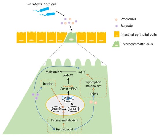 In this study, we found that propionate and butyrate-producing bacteria, R. hominis, induced melatonin synthesis both in the intestinal mucosa and BON-1 cells. The underlying mechanisms involved promoting the 5-HT production and activating the p-CREB-AANAT pathway through propionate and butyrate.