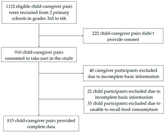 Participants were recruited from two primary schools using cluster sampling in Hongshan district, Wuhan, China in April 2016. Considering that the children’s diet needed to be self-reported and the cognitive ability of students in lower grades is limited, in the current study we selected students in grades 3rd to 6th and their caregivers as subjects. Initially, 1132 eligible child-caregiver pairs were recruited. Of these, 317 were excluded due to incomplete information or not providing consent. Therefore, this analysis was based on a final sample of 815 child–caregiver pairs. Figure 1 provides an overview of the recruitment process. This study was conducted according to the guidelines of the Declaration of Helsinki and all procedures involving human subjects were approved by the Ethics Committee of Wuhan University of Science and Technology (No. 201519). All parents gave written informed consent and children gave assent.