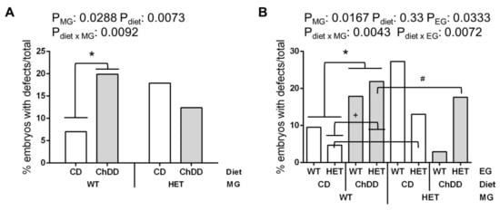 Figure 2. Effect of synthetase deficiency and low choline diet on incidence of defects at E10.5. Values are % embryos with defects/total embryos evaluated. n = 33–78 embryos from 16–18 litters per group, analysed by binary logistic regression including litter as a random effect, post hoc by mvt. (A) Maternal effects, with embryo genotypes grouped. * Significant increase in defects due to ChDD in the litters of WT mothers compared to CD WT mothers (p = 0.0259). (B) Genotype and diet effects, including embryonic genotype. * Significantly increased in ChDD WT mothers as compared to CD WT mothers (p = 0.0237). # Significantly increased in ChDD HET embryos as compared to CD HET (p = 0.0350). + Significantly increased in ChDD HET embryos with WT mothers as compared to CD HET embryos with WT mothers (p = 0.0030). White bars: CD, grey bars: ChDD.