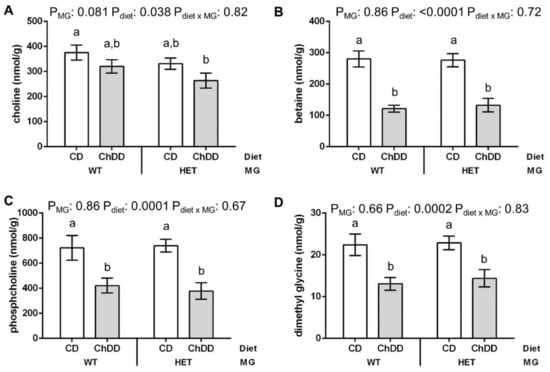 Figure 3. Effect of maternal synthetase activity and low choline diet on choline and methyl metabolites in maternal liver. Values are means ± SEM, n = 6 per group. Choline (A), betaine (B), phosphocholine (C), and dimethylglycine (D) were significantly lower in ChDD livers. Analysed by 2-way ANOVA; means without a common letter differ significantly by Tukey post hoc (p < 0.05). White bars: CD, grey bars: ChDD.