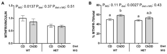 Figure 5. Effect of synthetase deficiency and low choline diet on maternal liver MTHFR expression. A representative blot is shown in Figure S6. (A) Total MTHFR expression, normalized to vinculin. (B) Expression of the more active 70 kDa isoform of MTHFR, as a percentage of total MTHFR. Values are means ± SEM, n = 6 per group. Analysed by 2-way ANOVA; means without a common letter differ significantly by Tukey post hoc (p < 0.05). White bars: CD, grey bars: ChDD.