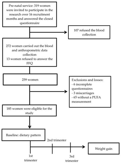 The women who fulfilled the eligibility criteria (n = 319) were invited to take part in the research and answered a closed questionnaire. Blood samples and anthropometric data were collected from 272 women. Thirteen were excluded for refusing to answer the food frequency questionnaire (FFQ), six were excluded for not answering the whole questionnaire, three were excluded for having a miscarriage, and 65 women were excluded for not having PUFA measurements. After these exclusions, 185 women were monitored during pregnancy, in the period from August of 2013 to December of 2014. The cohort flowchart is presented in Figure 1.