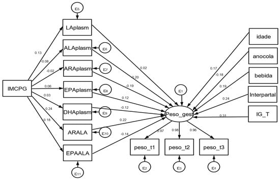The direct association between plasma levels of PUFAs and the “gest_weight” construct, adjusted by the pre-gestational BMI, maternal age, interpartal interval, years of schooling, maternal alcohol consumption, and gestational week, varied according to the class of PUFA (ω-3 and ω-6). It was observed that the ω-3 represented by ALAplasm, DHA, and the EPA/ALA ratio were directly and negatively associated with weight gain during pregnancy (−0.20, −0.12, and −0.14, respectively), with it being indicated that the women with a higher rate of gestational weight gain had lower plasma concentrations of ALA and DHA.