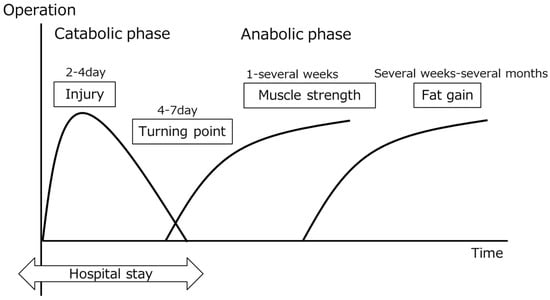 When stress, such as surgery, infection, and burn, is loaded, the body exhibits a defense reaction and induces metabolic, immune, and endocrine changes. The changes in parameters simply monitored in routine clinical practice include fever, C-reactive protein (CRP) increase, peripheral blood leukocytosis, lymphocytopenia, and a decrease in urine volume. These inflammatory reactions become strong as stress increases and the time to recovery extends with it. Regarding the time-course metabolic changes, according to Moore et al., the stress period (phase 1) continues for 2–4 days, followed by a 4–7-day turning point (phase 2), and then the anabolic phase. Regeneration of muscle protein (muscle strength: phase 3) occurs one to several weeks after surgery, followed by the fat accumulation period (fat gain: phase 4), extending for several weeks to several months (Figure 1) [1]. Energy consumption increases due to stress. In the estimation of energy consumption using the Harris–Benedict equation, the coefficient multiplying the resting energy expenditure (REE) is set up to 1.0–2.0 in consideration of the severity of stress [2,3]. Under stress, synthesis of acute-phase proteins, such as CRP, ceruloplasmin, and fibrinogen, increases, and the synthesis of negative acute-phase proteins, such as albumin and transthyretin, decreases [4]. Muscle protein is decomposed and mobilized for tissue repair, gluconeogenesis, and energy production [5,6]. To estimate the degree of protein catabolism clinically, urinary urea nitrogen (UUN) is measured [7]. Normally, 7–13 g/day of UUN is excreted, but excretion increases in response to stress, and it may exceed 20 g/day in critically ill patients. Nitrogen balance is calculated from the nitrogen dose and nitrogen excretion, and the value becomes negative due to catabolic promotion under stress. After nutrition management, including protein and amino acid administration, the balance subsequently turns positive as the course enters the turning point [8,9]. Regarding nutrition management, nutrients administered after the protein anabolic phase are absorbed and utilized as usual, but a sufficiently effective utilization of nutrients exogenously administered in the stress period is impossible and excessive administration induces metabolic complications, thereby increasing stress [10]. In inpatient treatment aiming at surgery, treatment in the stress period over the turning point is performed and consideration of metabolic changes is necessary for perioperative management. In this review, the significance of nutritional therapy as a stress-reducing measure and the stress-reducing effects of the amino acids cystine and theanine, which promote glutathione (GSH) synthesis, are described.