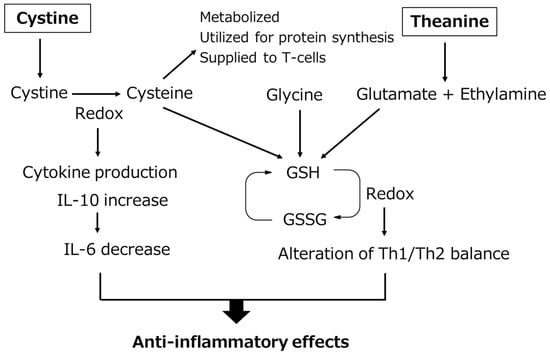 - Kurihara, S.; Shibakusa, T.; Tanaka, K.A. Cystine and theanine: Amino acids as oral immunomodulative nutrients. SpringerPlus 2013, 2, 635. [Google Scholar] [CrossRef] [PubMed]
