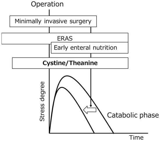 Metabolic changes centering on the endocrine, nervous, and immune systems occur after surgery, and energy consumption and protein catabolism increase. The metabolism returns to normal after the tuning-point in which recovery from the stress period starts. During hospital stay, management of the stress period over the turning point is necessary. To improve management, a reduction of the stress of surgery itself is one of the most important elements. In addition to this, perioperative management is important. ERAS proposed from North Europe is a bundle of many elements to reduce stress, its effects have been demonstrated at clinical sites, and its use is spreading worldwide [37,38]. ERAS recommends avoiding fasting before surgery as much as possible and early use of the gastrointestinal tract. We also noted the stress-reducing effects of early enteral nutrition in patients treated by gastrectomy. It was also mentioned in this review that, based on animal experiments and clinical studies, the amino acids cystine/theanine suppress the decrease in GSH in cells and exhibit the surgical stress-reducing effects through anti-inflammatory and immune adjustment actions. The dose in humans is 700 mg of cystine and 280 mg of theanine; being low, compliance with ingestion is high, and their use is versatile and highly safe [39]. Therefore, the goal of perioperative management, especially the goal of nutritional therapy, should not be set to supplement lost energy and protein, but to early recovery to a state in which administered energy is normally metabolized, i.e., how to reduce stress should be set as the first target (Figure 4). By achieving this, it may result in the inhibition of postoperative complications and a shortening of hospital stay.