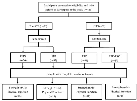 Flowchart of the participants allocation process, sample randomization, and dropout rates at each stage of the study. CON: control; PRO: whey protein supplementation; RTP: resistance training program.