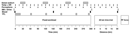 Timeline for the experimental procedures showing when the measurements of skin and rectal temperature (Temp), heart rate (HR), perceptions of thirst, effort, heat stress and abdominal discomfort (Perceptions), body mass (BM), urine specific gravity and osmolality (Urine), hematocrit, hemoglobin, sodium (Blood), sweat sodium concentration (Sweat sodium) and oxygen consumption () were taken. The experiment was divided in three phases, a 5 h fixed-workload exercise period, a 20 km time-trial and a plantar flexors (PF) force measurement protocol.